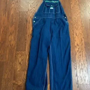 Classic Liberty overalls in dark blue. Features green stitching and gold buttons. Ideal for everyday style.