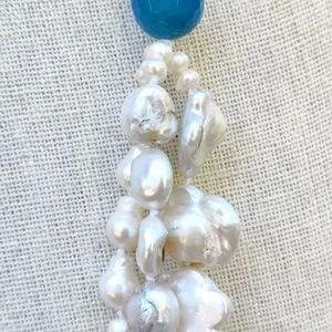 Gorgeous 30" blister pearl and baroque pearl necklace with large blue agate stones