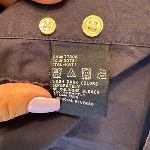 Classic and bold, this Tommy Hilfiger men’s button-down shirt in size Large features vertical red piping stripes on a navy blue base for a standout look. Made of 100% cotton with a button-down collar, chest pocket with embroidered logo, and a sharp preppy aesthetic.