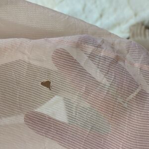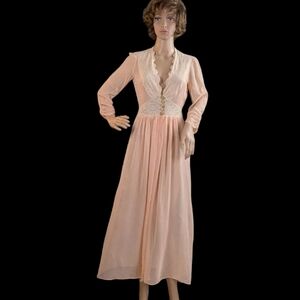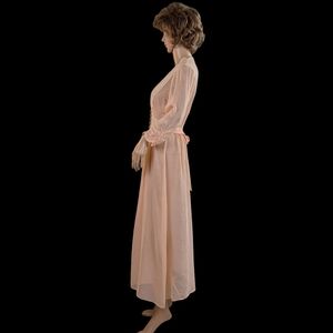 This beautiful vintage negligee has a lace trimmed bodice with scalloped edges, and ruched sleeves. The lace waist has 5 buttons, loop closure, and it's open from the down. It's a delicate, sheer, peach color with off-white lace. It ties in back, but once you tie it, you can leave it that way, because it buttons in front.