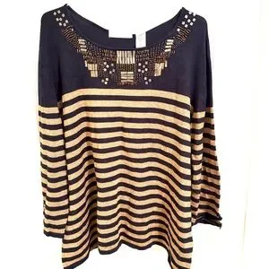 Chic long sleeve top with bold black and gold stripes. Features unique neckline embellishments. Ideal for stylish occasions.