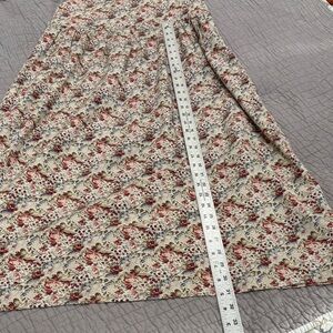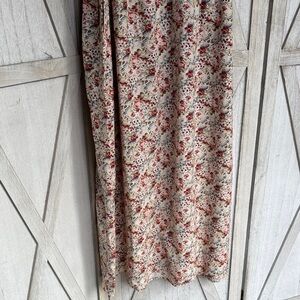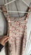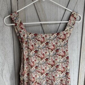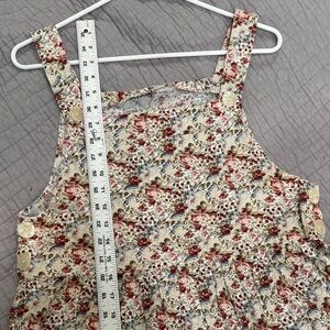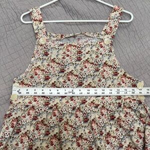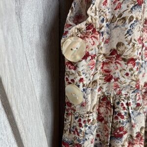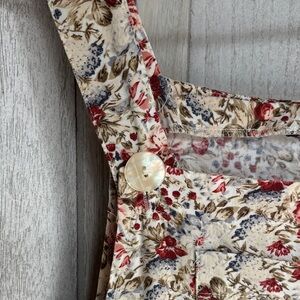 Charming floral dress with overall style button straps. Features a mix of red, cream, and blue flowers.