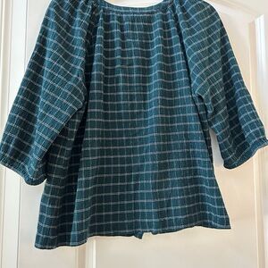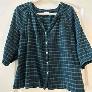 J. Jill plaid 3/4 length sleeve v neck button down top. Dark green. Classic. PXL