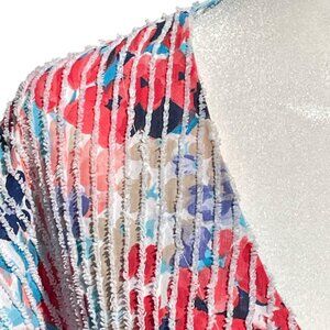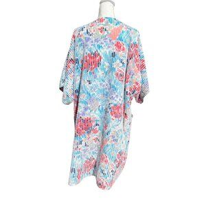 Step back in time with this vintage Crowntuft floral housecoat dress, made in the USA from a soft, easy-care cotton/polyester blend. This colorful button-front duster dress features a cheerful allover floral pattern in turquoise, red, lavender, and ivory, with two front patch pockets and short dolman sleeves for a relaxed, airy fit.