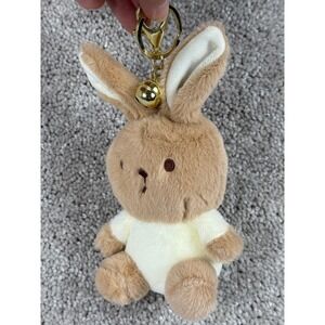A charming plush bunny rabbit keychain with a delightful golden bell. This adorable accessory features a soft, light brown plush body with a creamy white tummy and inner ears, accented by embroidered facial features and a small, rounded tail. It's attached to a sturdy gold-tone keyring and clasp, perfect for adding a touch of cuteness to your keys, backpack, purse, or travel bag. This versatile keychain makes a wonderful gift for Easter, birthdays, or as a sweet everyday treat.