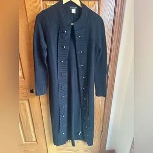 Gorgeous long duster cardigan sweater by Venus. Ribbed trim and gold button detail. Size small. Pit to pit and length measurements in photos.