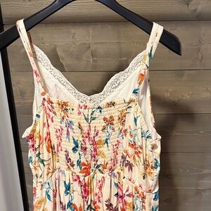 Floral maxi dress with lace trim. Features vibrant colors and a flowing design. Perfect for casual outings.