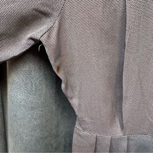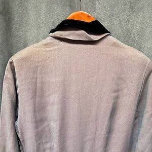 Sharkskin dress with black velvet trim on the collar and cuffs. It has lightning / discoloration across the top of the shoulders.