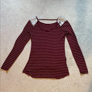 Striped Burgundy Long Sleeve Top with Lace Detail. Size small good condition