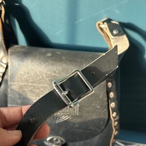 Black leather bag with Harley-Davidson emblem. Features studded accents and metal clasp.