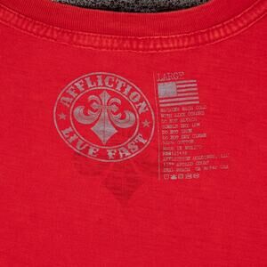 Pre-Owned: Affliction Graphic T Shirt; Live Fast line. Black Graphic on Red Background; Distressed/ Splatter Design; Ornate Skeleton Skull Design; Crest on Back. This item is in good, pre-owned condition with some overall fading--no rips, holes, or stains. Please check measurements before purchasing. Men's size LARGE. Measurements: