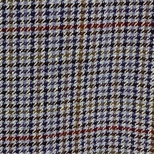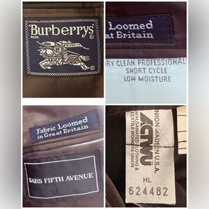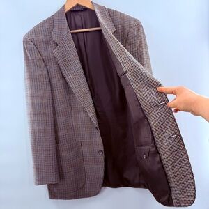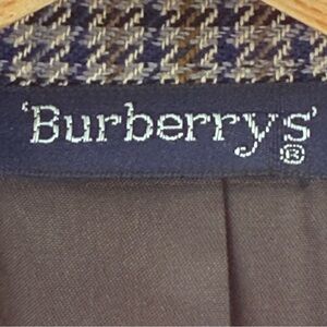 Burberrys' vintage two-button houndstooth pattern; brown and tan colors with navy blue accents, notch lapel, front patch pockets, 100% wool material with viscose lining.