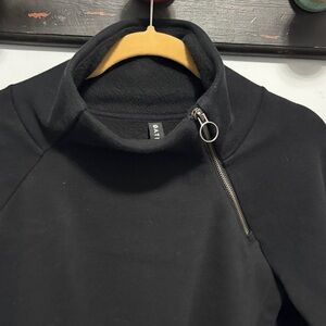 Athleta size small tall (ST) black sweatshirt with an asymmetrical zip design at the neckline. Has thumb holes and a scalloped front bottom. I got a tall so I could wear this as a tunic over leggings (and cover my behind!). Perfect for a chic look.