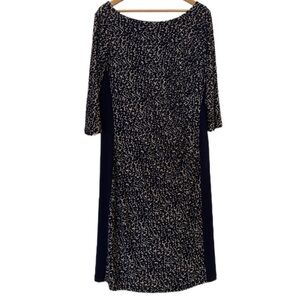 Chic long sleeve dress with a navy blue and cream pattern. Perfect for elegant occasions.