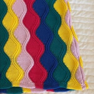 Vibrant sweater with wavy pattern. Features a mix of blue, pink, yellow, and green. Perfect for playful days.