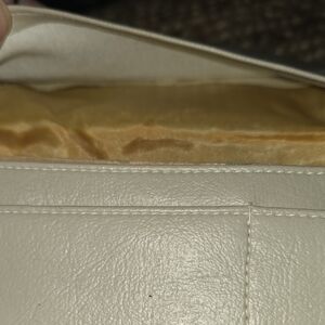 Vintage floral clutch/handbag. Featuring a green, pink, and yellow floral/textured pattern with a beige background. Snap clasp closure and kiss lock closure, with a zipper pouch and larger pockets.