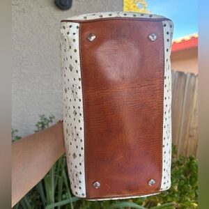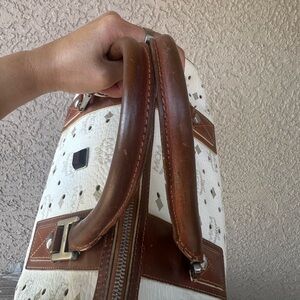 Stylish MCM satchel with white body and brown handles. Iconic design with signature pattern. Perfect for daily use.