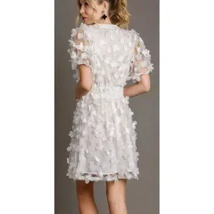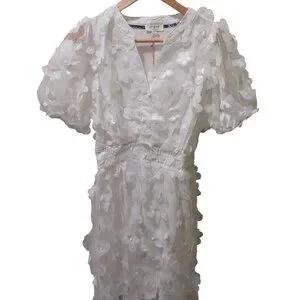 NWT Umgee White 3D Organza Split Neck Dress/Puff Sleeve Dress SMALL