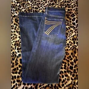 Chic boot cut jeans in dark blue. Features stylish gold stitching on pockets. Perfect for versatile wear.