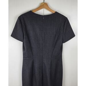 HUGO BOSS 100% Wool Melange Micro Check Two Toned Short Sleeve Sheath V Neck Pleated Midi Dress in Gray Black | US 8 - UK 12 - IT 44 / Medium