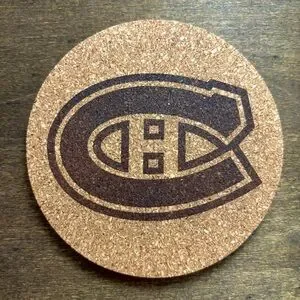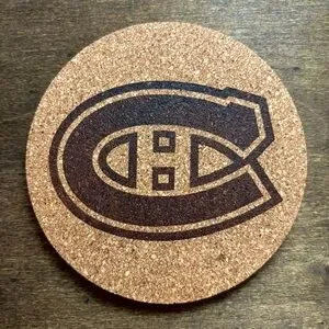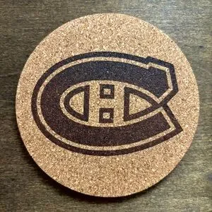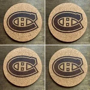 Four laser engraved cork coasters of the Canadiens logo reserved for @up_north_and_co
