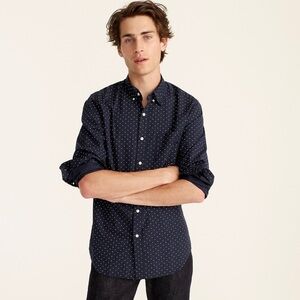 J. Crew Men's Stretch Secret Wash Organic Cotton Poplin Shirt - Navy Blue with tiny white polka dots