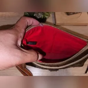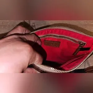 Pre-loved Dooney and Bourke wristlet with ostrich textured finish and red interior. Features gold zipper with tassle.