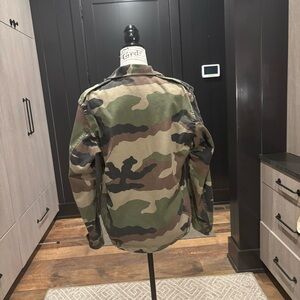 Authentic vintage woodland camouflage military field jacket featuring a button-front closure and Velcro panels for adding name tags or patches — a true customizable vintage piece.