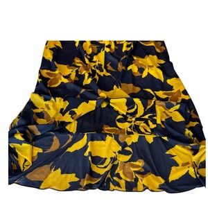 Cabi Navy Floral Midnight Dress has an empire waistline with ruffle detailing and a flounce hemline. Midi length with a modest front slit.