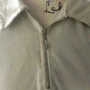 Super soft and stretchy shirt that has the seams in a ivory with contrasting stitch as accents. Snaps up the right side and small pocket on left sleeve along with zip neck make this an interesting shirt. 3/4 length sleeves. EUC laundered in a natural detergent. See photos for measurements