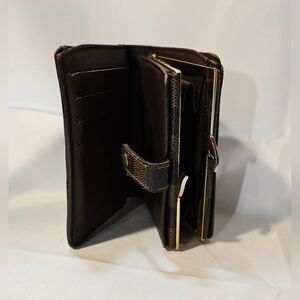This classic Kiss-Lock Wallet is crafted of Louis Vuitton Damier Ebene canvas with a polished gold snap closure that opens to a brown cross-grain leather interior. Features patch pockets, multiple credit card slots, and an iconic kiss-locked pocket. Decent used condition reflected in the listing price.