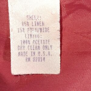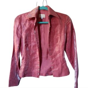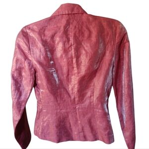 Pre-owned item in good condition. No rips, tears, or discoloration. Chic metallic red blazer with unique clasp details. Perfect for adding flair to any outfit. Great color for the Holidays. Please see pics for more details. Measurements are approximate: