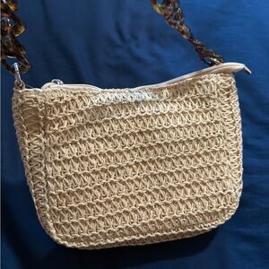 Discover elegance with this cream knit bag, featuring a stylish tortoise chain strap. Perfect for any occasion.