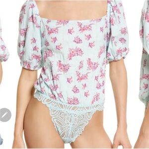 Free People Blue Pink Angela Floral Print Lace Bodysuit Off Shoulder Small