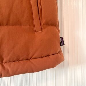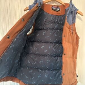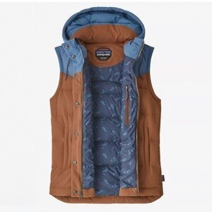 Patagonia Bivy Hooded Puffer Vest/Brown & Blue/ Snap and Zip Front/600 fill Down