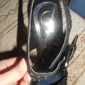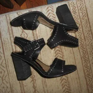 New in box. Carlos Santana black chunky block heels. Adjustable ankle strap. Silver hardware. Silver stud details. Suede like upper. Open toe sandal. Heel height about 4". Vintage look. Early 2000's.