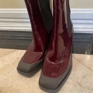 Heavier weight, perfect for fall and winter in a rich deep red color! Patent leather, rubber trims, elasticized sides, block heel, pull-on, rubber sole. New worn! Orig. $525