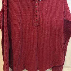 This is a long-sleeve waffle-knit Henley top in a deep cranberry red color. It features a partial button placket with small round buttons down the front and decorative stitching around the neckline. The neckline also has dark embroidered detailing that adds a subtle boho or vintage-inspired touch. The soft, textured fabric gives it a cozy and casual look, perfect for layering or wearing on its own for a relaxed fall or winter outfit.