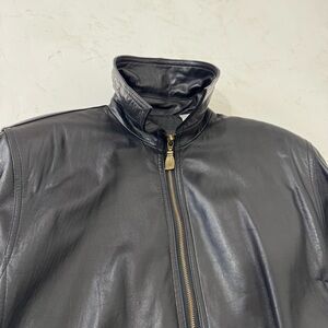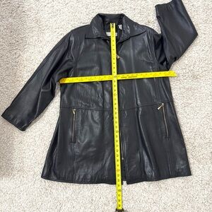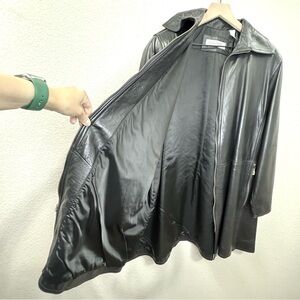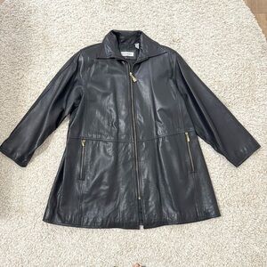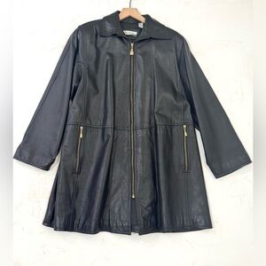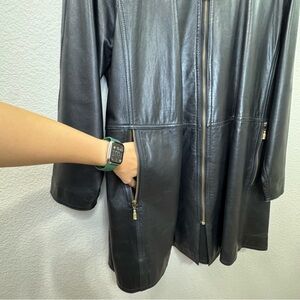 Sleek and minimal vintage black leather coat by Evan Davies. Made in Korea with buttery-soft genuine lambskin leather and fully lined. Features gold-tone zippers, front zip closure, and roomy side pockets. Slight A-line silhouette for a flattering, easy fit.