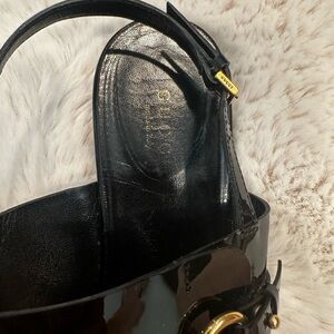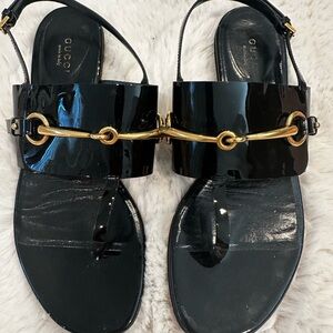 Glossy black sandals with gold detailing. Elegant and stylish design. Perfect for any occasion.dust bag included-Offers welcome! Bundle for additional savings! 100% Authentic - 100% Positive Feedback -
