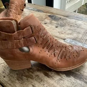 Tan leather buckles and studs.Chunky heels. Great like new condition brass tone studs and buckles.Unique styling.Fast ship!