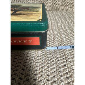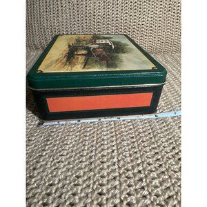 Decorative storage tin featuring a vintage illustration of a horse-drawn market wagon, offering a charming glimpse into early 20th-century commerce and transportation.