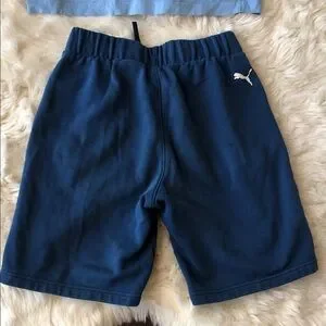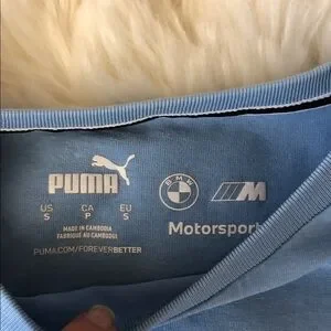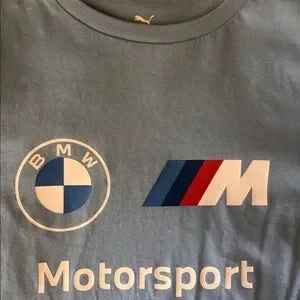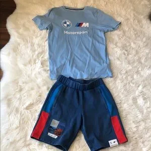 BMW Motorsport set with light blue T-shirt and beautiful 3-color Puma BMW shorts. Features iconic logo design.