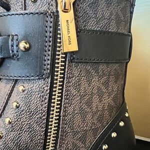These Michael Kors combat boots showcase a rich brown hue complemented by gold accents, exuding a luxurious and edgy appeal. Crafted with a durable sole and intricate detailing, they promise both style and longevity. Perfect for those seeking a blend of classic elegance and modern edge.