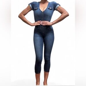 Bebe Blue denim deep V-neck Short Sleeve front zip jumpsuit. Features front and back pockets, and belt loops for added accessories. Denim is stretchy and snatches your curves.