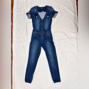 Bebe Blue denim deep V-neck Short Sleeve front zip Jumpsuit - Size 25
