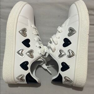 These SHEIN sneakers feature a sleek white base with striking black heart patterns, offering a playful yet stylish look. Crafted in a classic sneaker silhouette, they are perfect for adding a unique touch to any casual outfit.