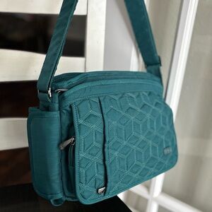 Excellent condition! Chic Lug crossbody bag with geometric quilting. Perfect for daily wear. Adds a stylish touch. Lightweight, quilted fabric. Flap with secure snap and zippered compartments. Adjustable crossbody strap for a customizable fit. Built-in RFID protection to safeguard personal information. Measures approximately 12”x7”x4” (Last picture is a stock image showing size). Smoke free home.