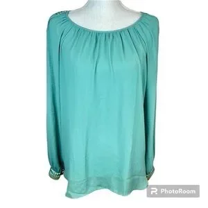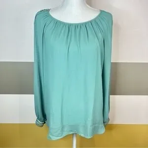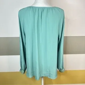 I have here this beautiful sea foam green business casual long sleeve blouse with lace cut out detailing on the sleeves. This blouse is by Loft and is a size medium.