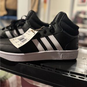 Stylish Adidas high-tops with classic black and white design. Perfect for everyday wear.